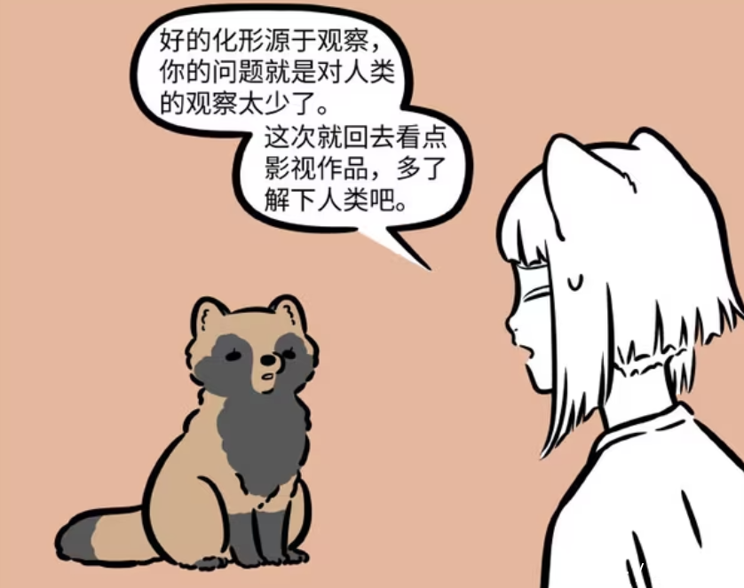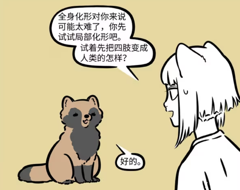 不过九月还是发现了问题,虽说部分化形成功,但何理明显有多余的变化。貉本来就有尾巴,只是九月没想到何理会将自己的尾巴变成一只手。这样一来,就有三只手两条腿,这种人类看起来不是更加奇怪。何理表示忘记人类尾巴是什么样子,所以只能变成手。九月告诉何理,人类是没有尾巴的,所以要变回去。