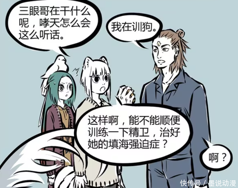 《非人哉》早期漫画的画面相对来说是粗糙一些,不过内容一样精彩。杨戬训练哮天很有一套,能够让他忍住不叼飞盘。九月求助杨戬,希望他能帮忙治好精卫填海的强迫症。虽然精卫是忍住了三分钟,不过想要奖励还是石子。